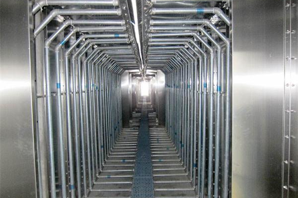 3)輸送鏈在室體內(nèi)運(yùn)行,頂部懸掛輸送鏈開口處設(shè)保護(hù)罩及正壓式風(fēng)幕封氣裝置,防止對(duì)懸鏈腐蝕。