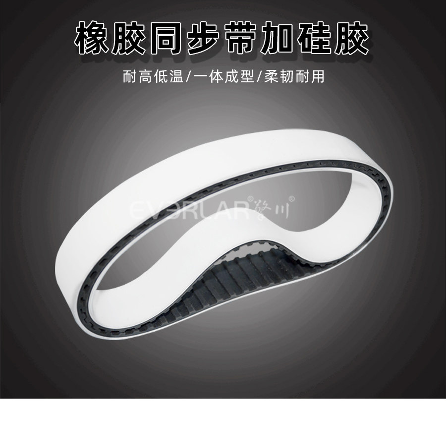 本樣品為同步帶加硅膠,同步帶為基帶,齒面加硅膠,我少有的皮帶工藝設計。同步帶表面的耐高溫硅膠耐受溫度可達-20至130攝氏度,使用溫度廣泛,隔熱阻燃,不導熱,不導電,具有很高的電阻率,同時對靜電具有很好抵抗性,對產品起到了保護作用。