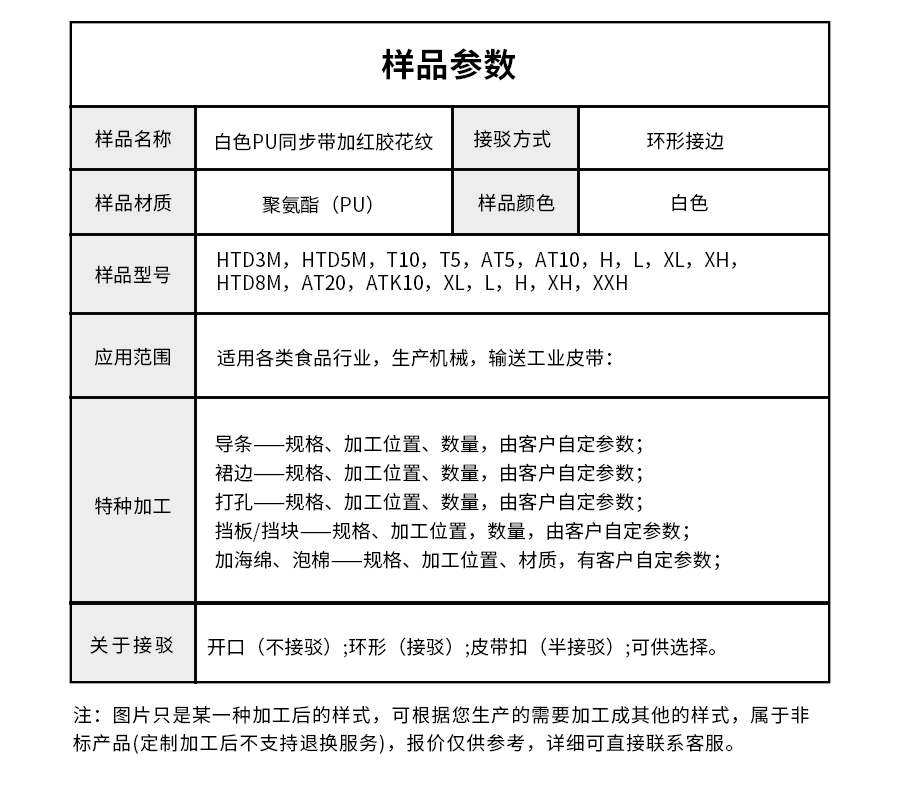 備注:PU同步帶加綠布圖片只是某一種加工后的樣式,可根據(jù)您生產(chǎn)的需要加工成其他的樣式,屬于非標(biāo)產(chǎn)品(定制加工后不支持退換服務(wù)),報價僅供參考,詳細可直接聯(lián)系客服。