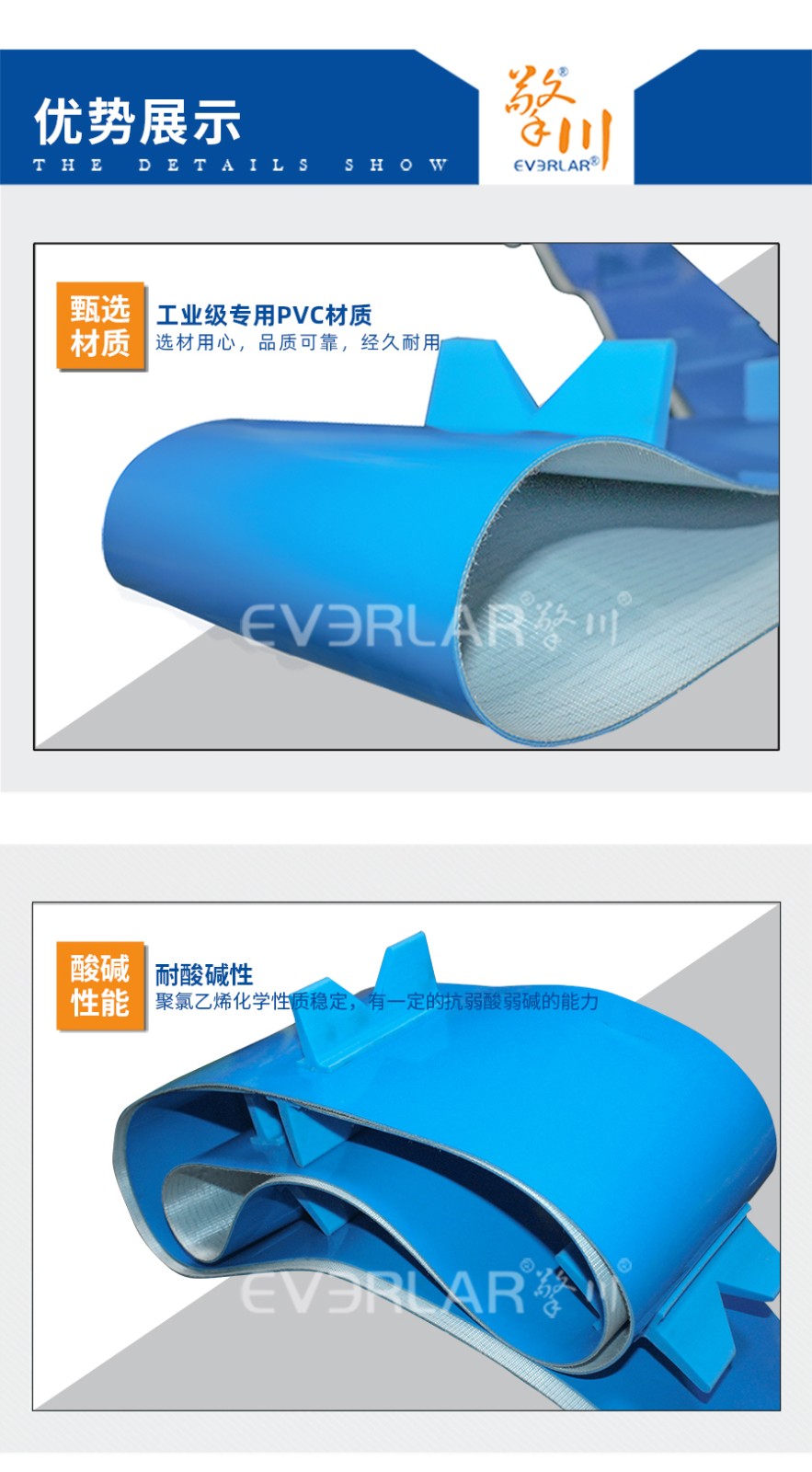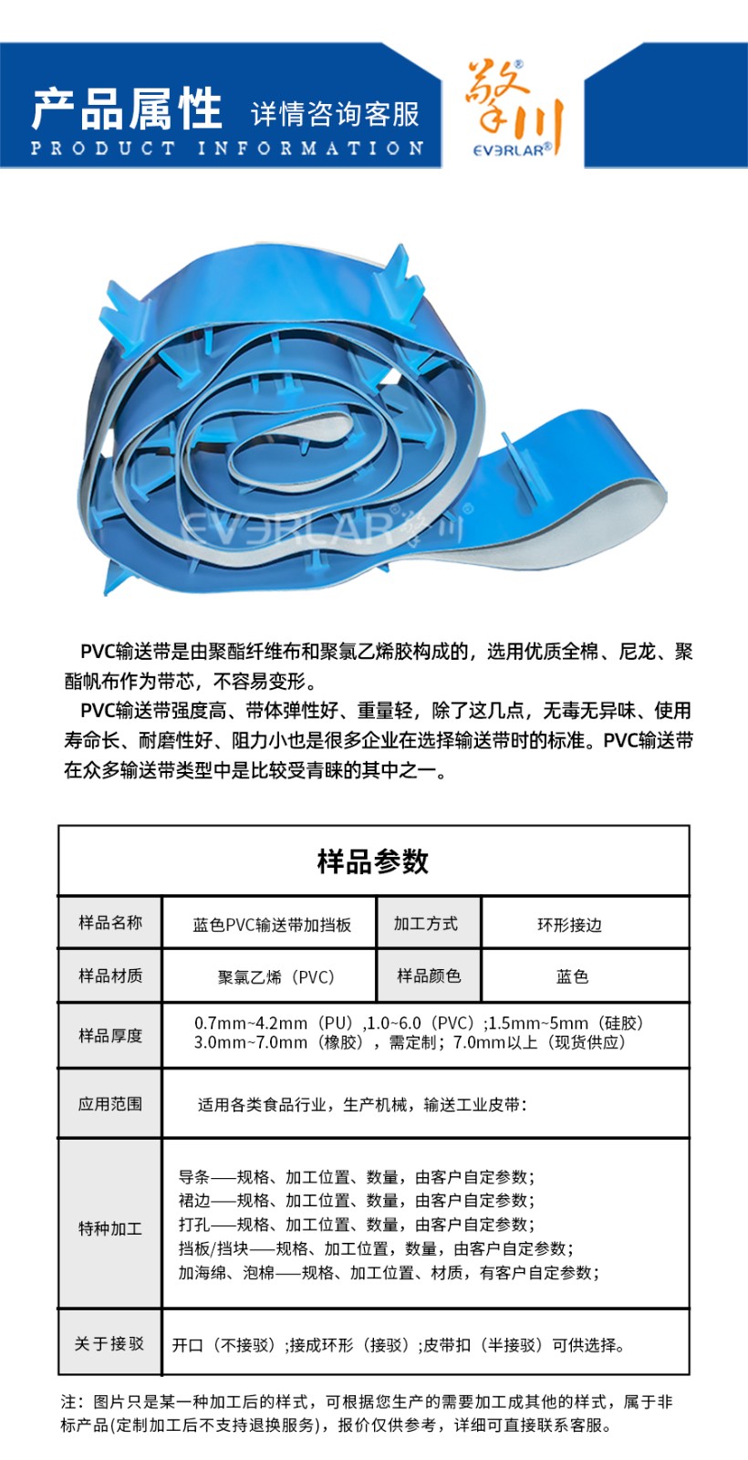 樣品名稱 | 藍色PVC輸送帶加擋板 | 加工方式 | 環形接邊 |