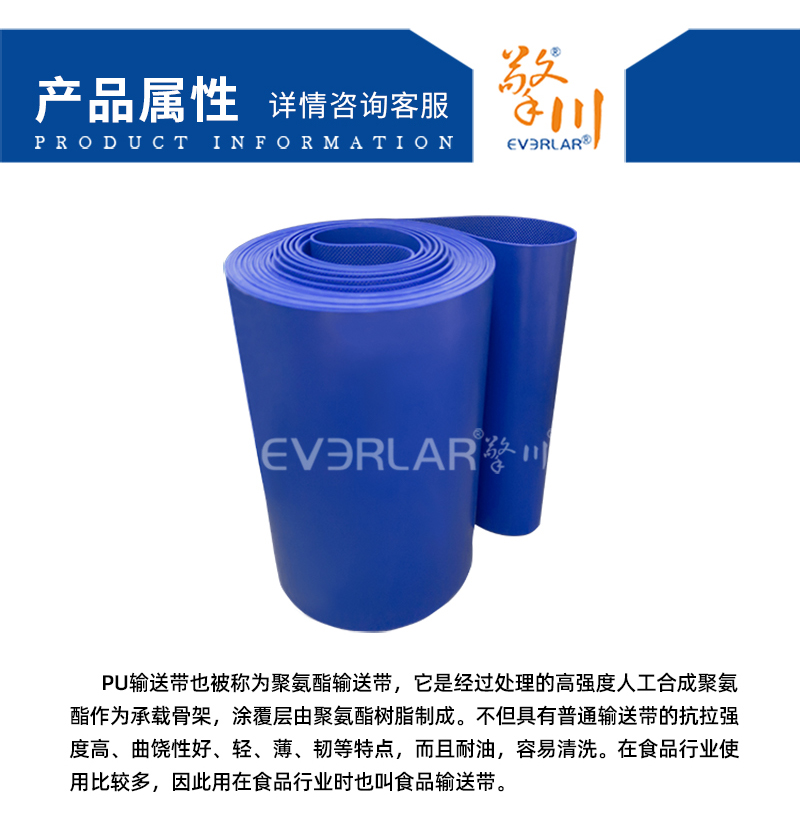 PU輸送帶也被稱為聚氨酯輸送帶,它是經過處理的高強度人工合成聚氨酯作為承載骨架,涂覆層由聚氨酯樹脂制成。不但具有普通輸送帶的抗拉強度高、曲饒性好、輕、薄、韌等特點,而且耐油,容易清洗。在食品行業使用比較多,因此用在食品行業時也叫食品輸送帶。