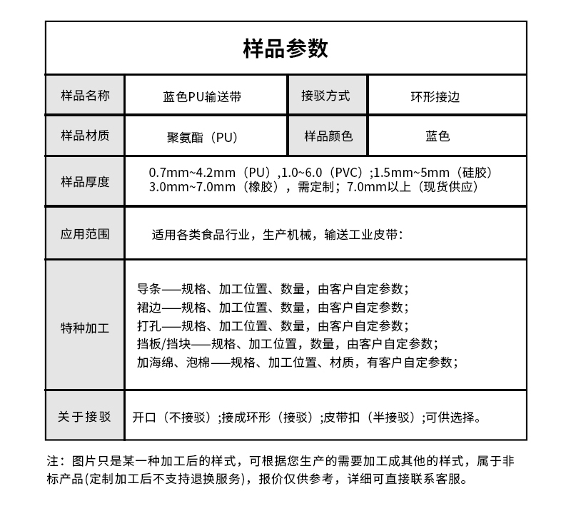 樣品名稱 | 藍色PU輸送帶 | 接駁方式 | 環形接邊 |