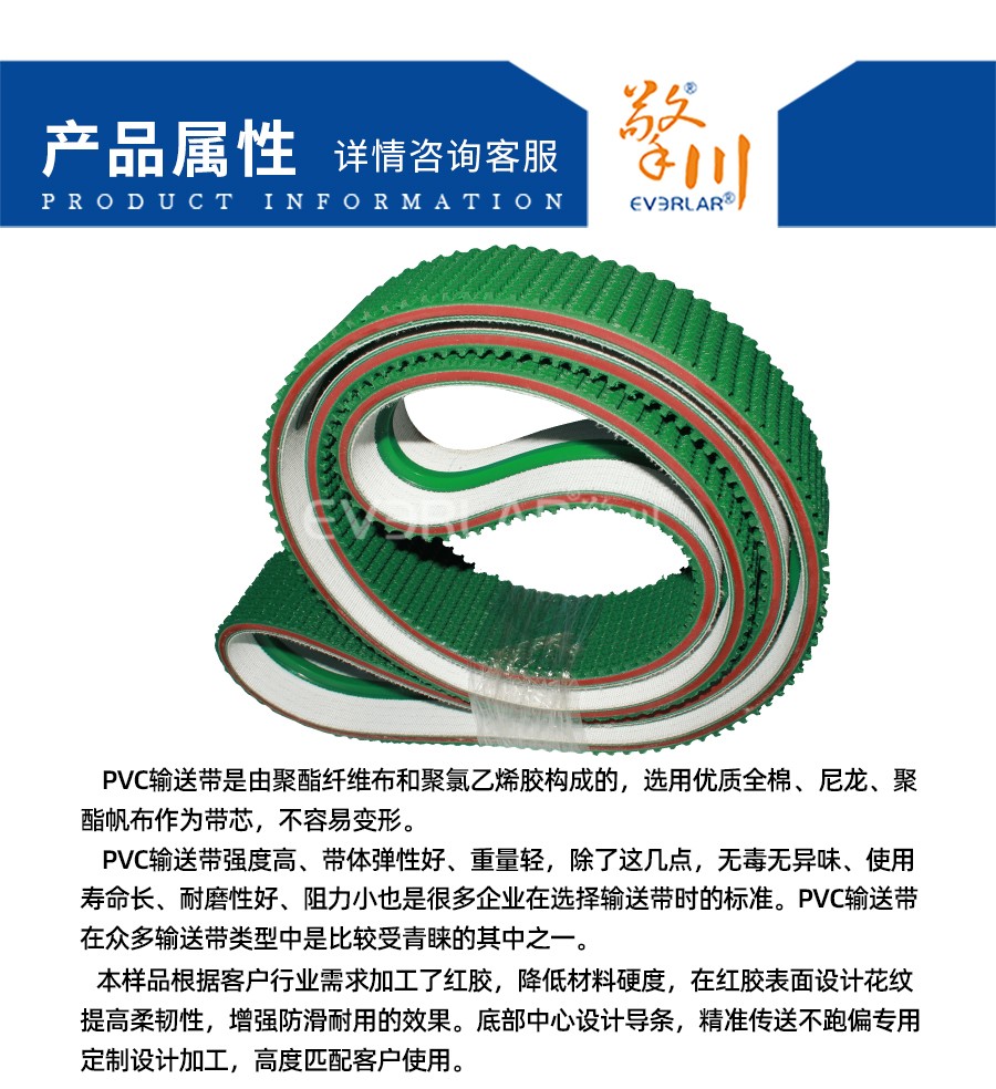 PVC輸送帶是由聚酯纖維布和聚氯乙烯膠構成的,選用優質全棉、尼龍、聚酯帆布作為帶芯,不容易變形。