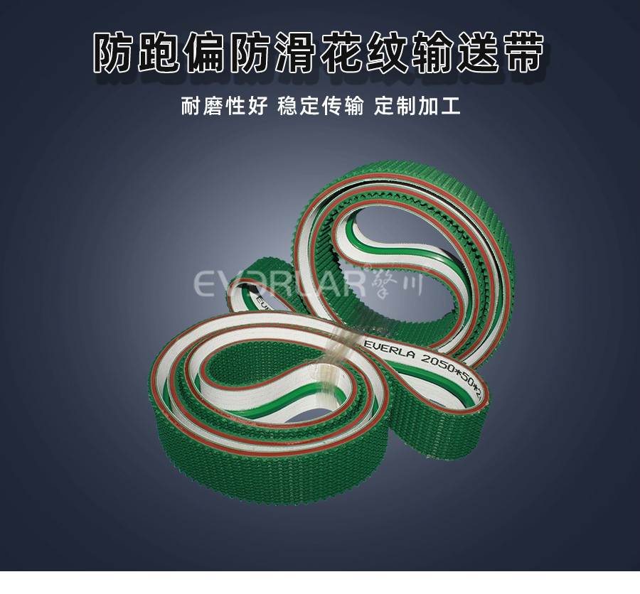 本樣品為防跑偏防滑花紋輸送帶,采用了PVC材質,根據客戶行業需求加工了紅膠,降低材料硬度,在紅膠表面設計花紋提高柔韌性,增強防滑耐用的效果。底部中心設計導條,精準傳送不跑偏專用定制設計加工,高度匹配客戶使用。