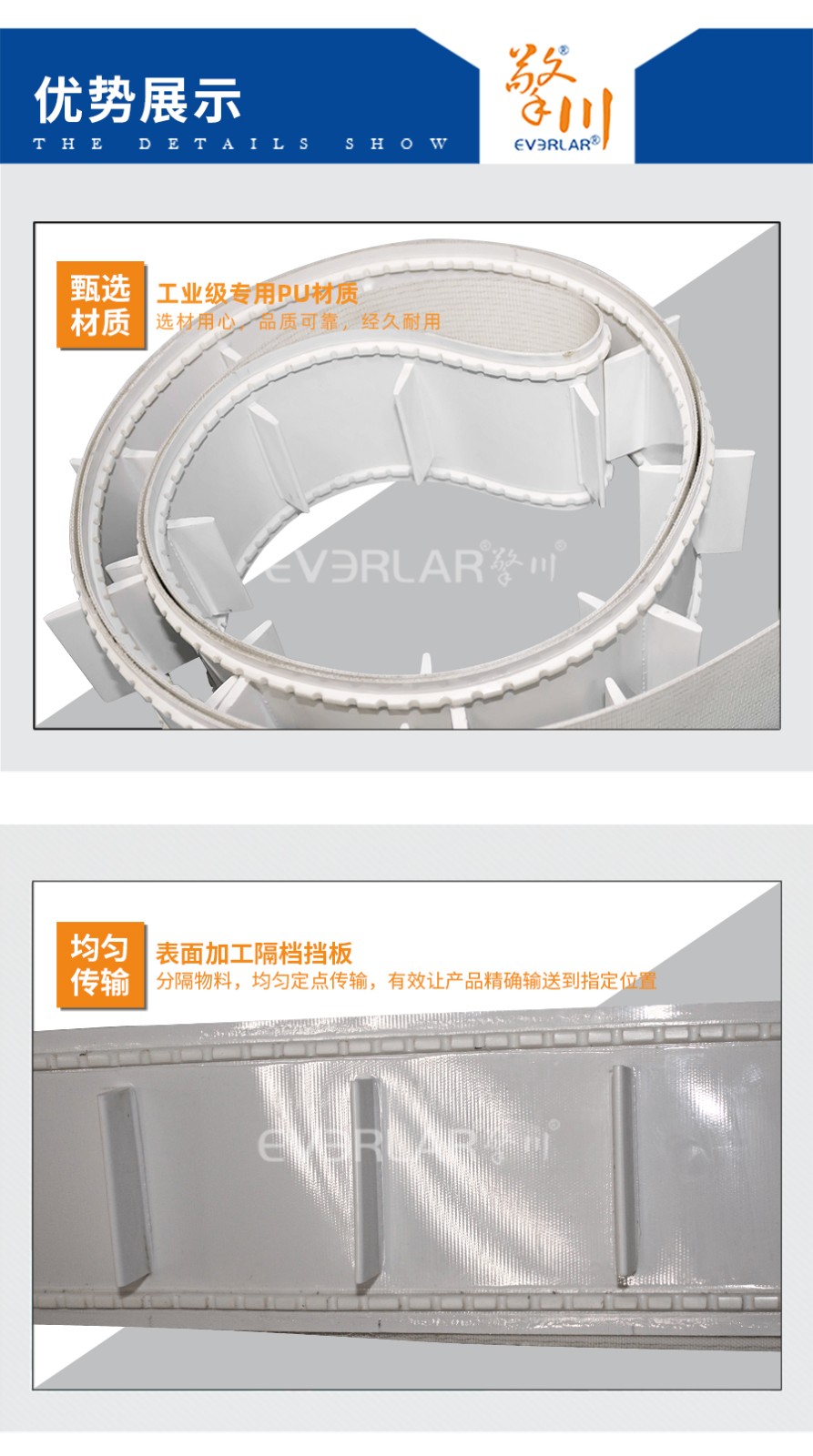 本樣品根據客戶行業需求加工定做,以PU輸送帶為底帶,加工擋板分格物料,均勻傳輸,帶子均勻承重,增加使用壽命。表面兩邊設計加工雙導條,減少物料掉落概率,高度匹配客戶使用。