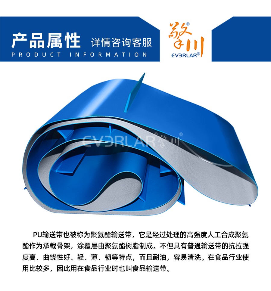PU輸送帶也被稱為聚氨酯輸送帶,它是經過處理的高強度人工合成聚氨酯作為承載骨架,涂覆層由聚氨酯樹脂制成。不但具有普通輸送帶的抗拉強度高、曲饒性好、輕、薄、韌等特點,而且耐油,容易清洗。在食品行業使用比較多,因此用在食品行業時也叫食品輸送帶。