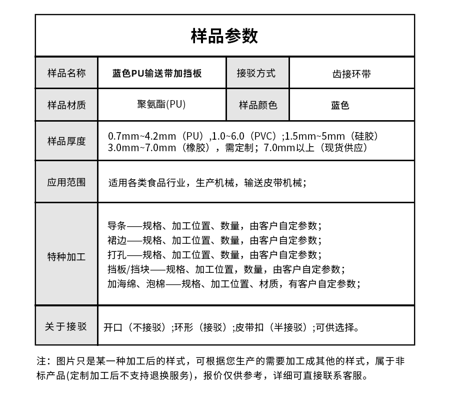 樣品名稱 | 藍色PU輸送帶加擋板 | 接駁方式 | 齒接環帶 |