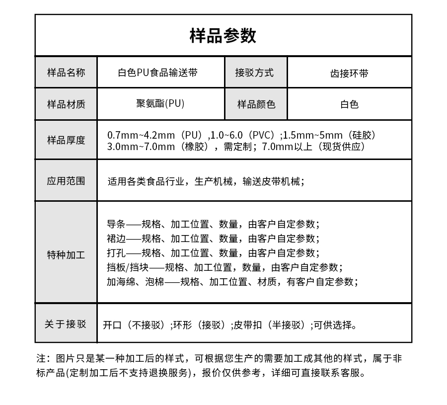 樣品名稱 | 白色PU食品輸送帶 | 接駁方式 | 齒接環(huán)帶 |