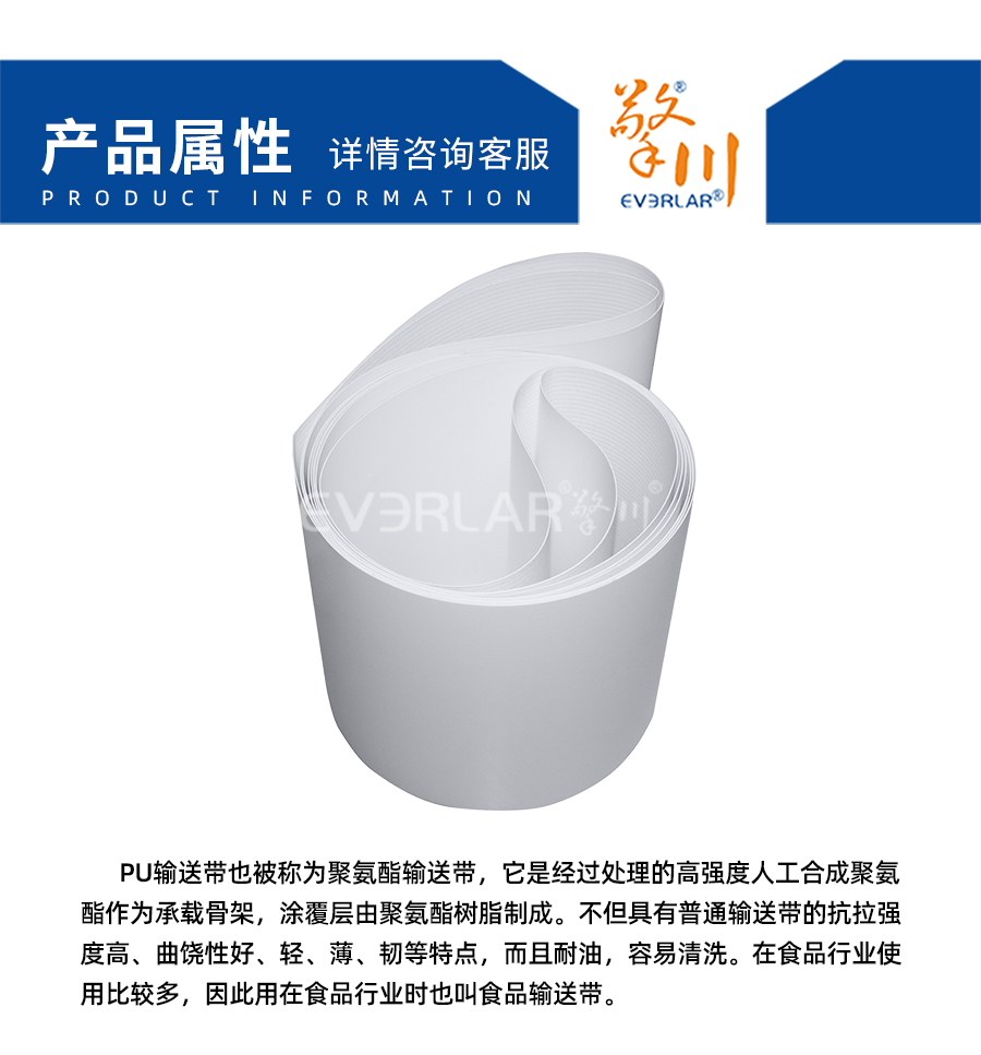 PU輸送帶也被稱為聚氨酯輸送帶,它是經(jīng)過處理的高強度人工合成聚氨酯作為承載骨架,涂覆層由聚氨酯樹脂制成。不但具有普通輸送帶的抗拉強度高、曲饒性好、輕、薄、韌等特點,而且耐油,容易清洗。在食品行業(yè)使用比較多,因此用在食品行業(yè)時也叫食品輸送帶。