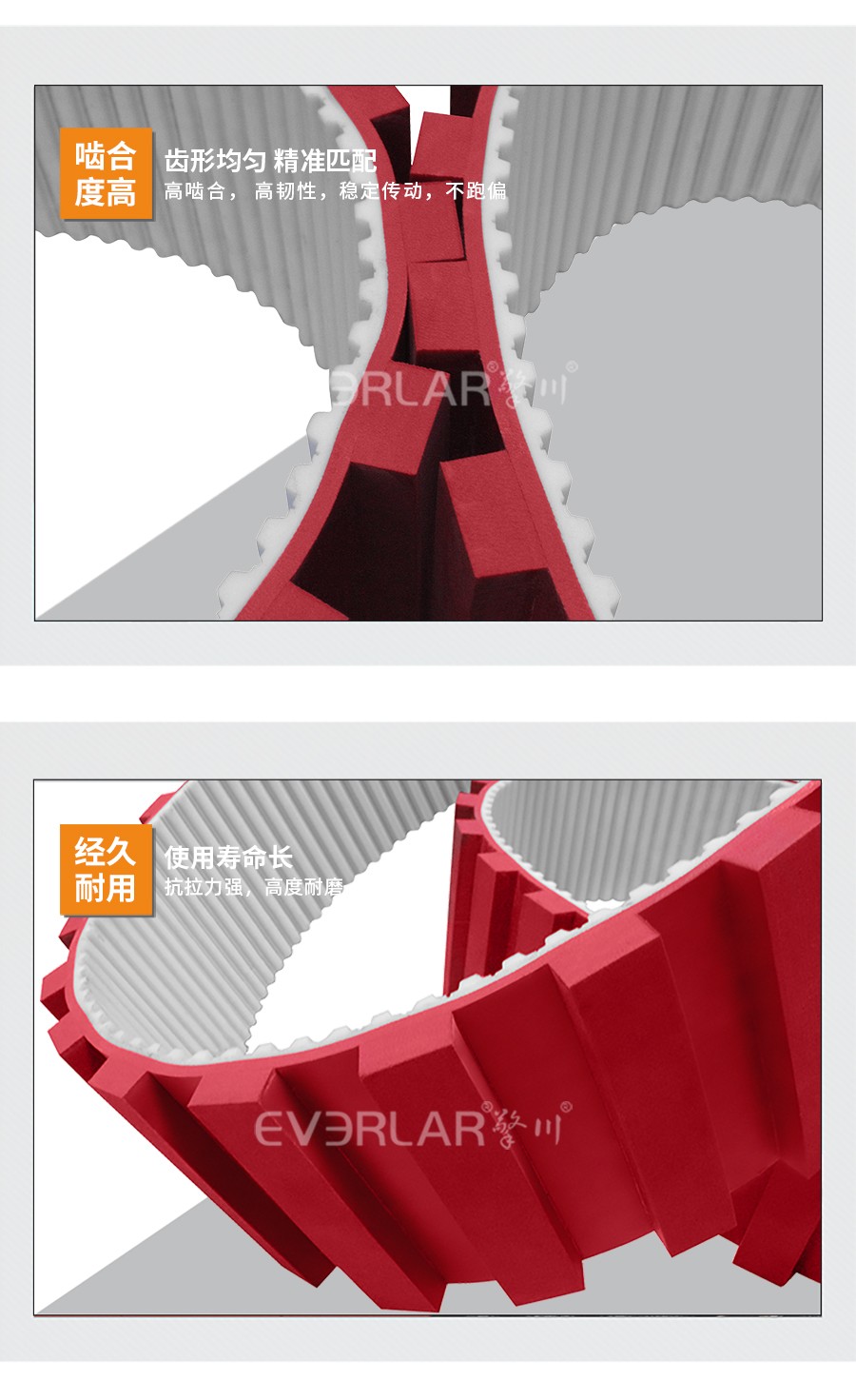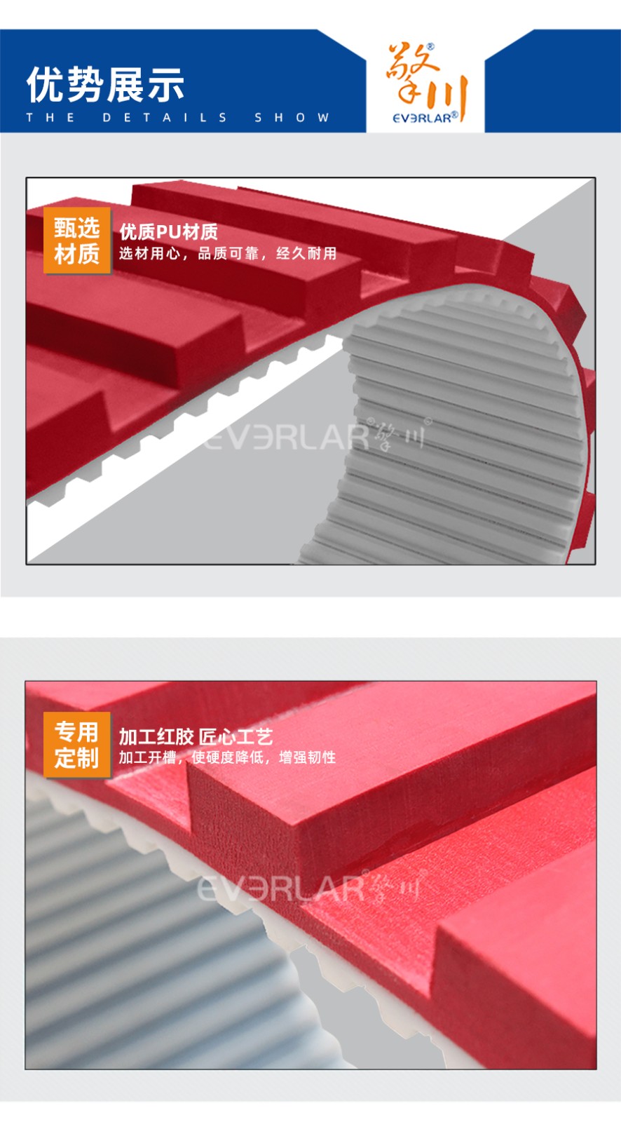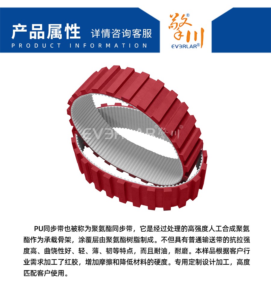 PU同步帶也被稱為聚氨酯同步帶,它是經(jīng)過處理的高強度人工合成聚氨酯作為承載骨架,涂覆層由聚氨酯樹脂制成。不但具有普通輸送帶的抗拉強度高、曲饒性好、輕、薄、韌等特點,而且耐油,耐磨。本樣品根據(jù)客戶行業(yè)需求加工了紅膠,增加摩擦和降低材料的硬度。專用定制設(shè)計加工,高度匹配客戶使用。