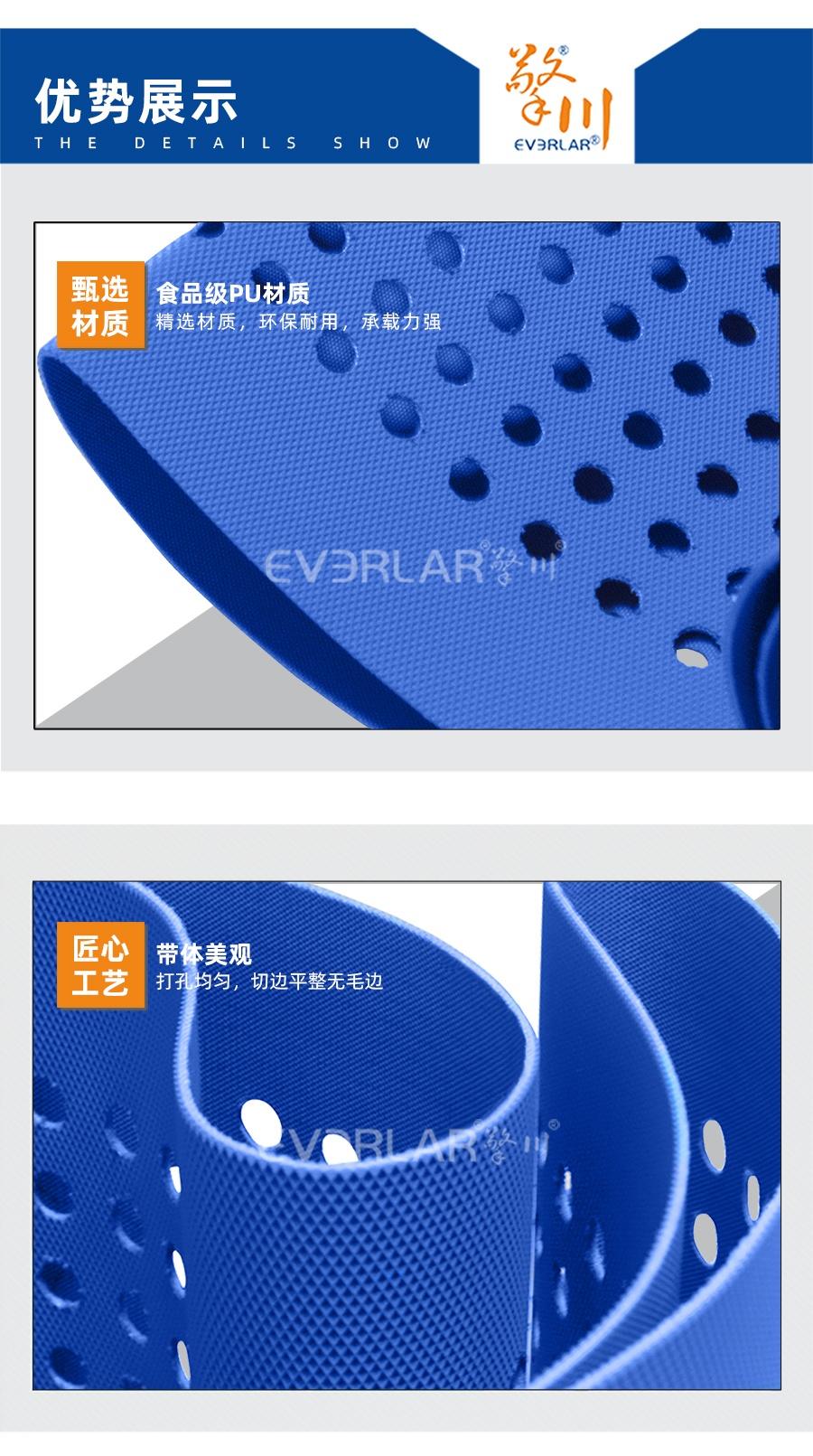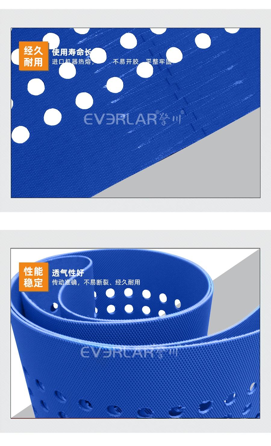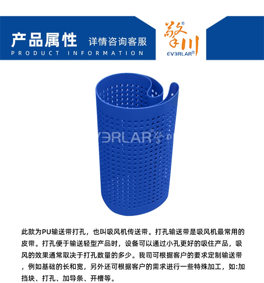 此款為PU輸送帶打孔,也叫吸風(fēng)機傳送帶。打孔輸送帶是吸風(fēng)機最常用的皮帶。打孔便于輸送輕型產(chǎn)品時,設(shè)備可以通過小孔更好的吸住產(chǎn)品,吸風(fēng)的效果通常取決于打孔數(shù)量的多少。我司可根據(jù)客戶的要求定制輸送帶例如基礎(chǔ)的長和寬,另外還可根據(jù)客戶的需求進行- -些特殊加工,如:加擋塊、打孔、加導(dǎo)條、開槽等。