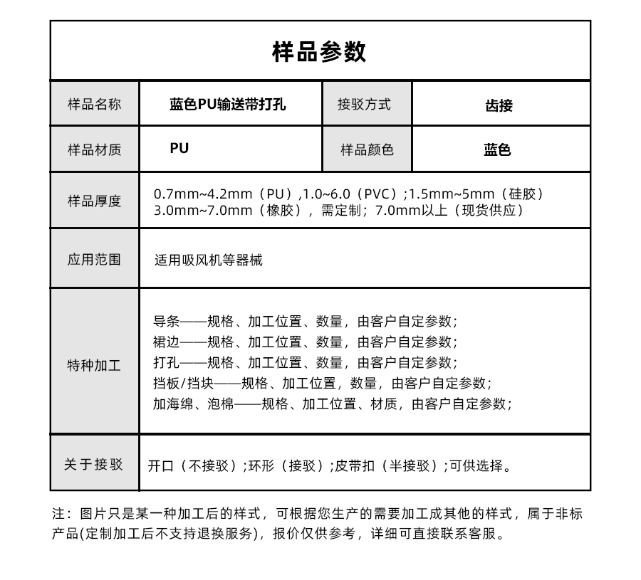 樣品名稱 | 藍色鉆紋PU輸送帶打孔 | 接駁方式 | 齒接 |