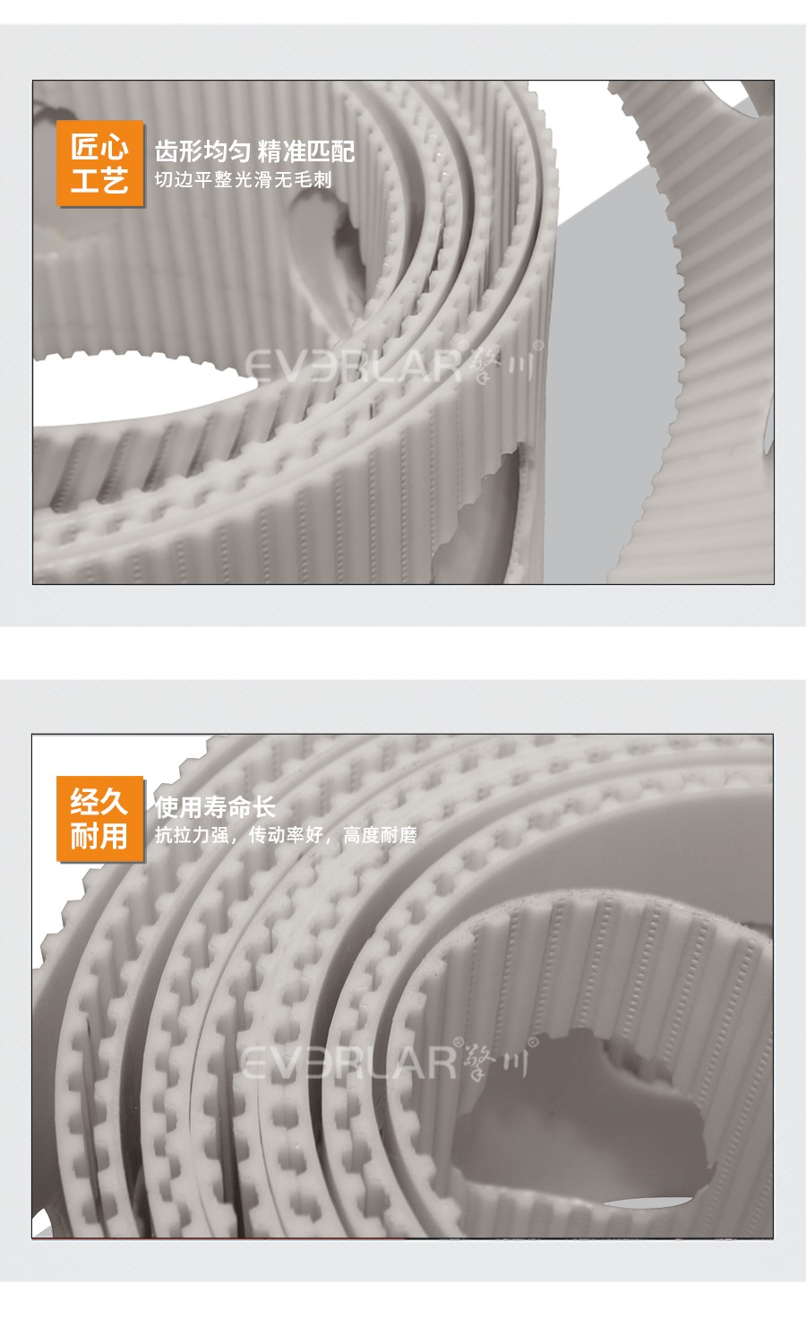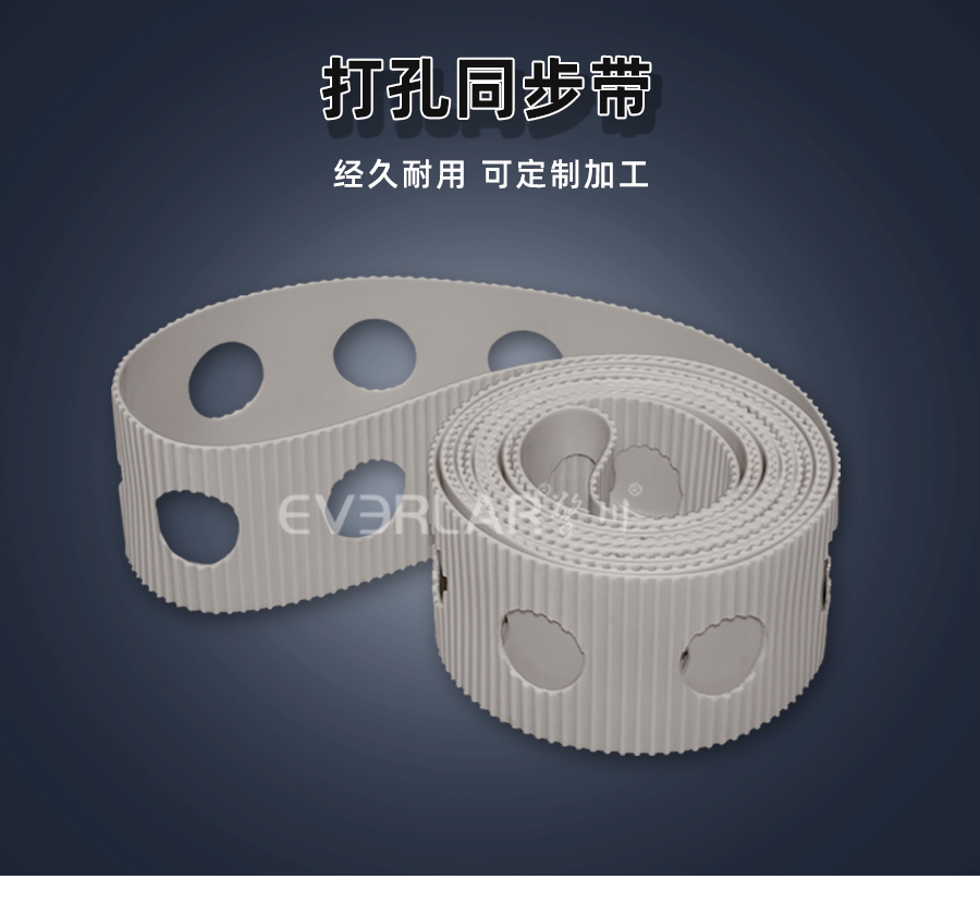 PU同步帶也被稱為聚氨酯同步帶,它是經過處理的高強度人工合成聚氨酯作為承載骨架,涂覆層由聚氨酯樹脂制成。不但具有普通輸送帶的抗拉強度高、曲饒性好、輕、薄、韌等特點,而且耐油,耐磨。本樣品根據客戶行業需求加工了打孔位,專用定制設計加工,高度匹配客戶使用。