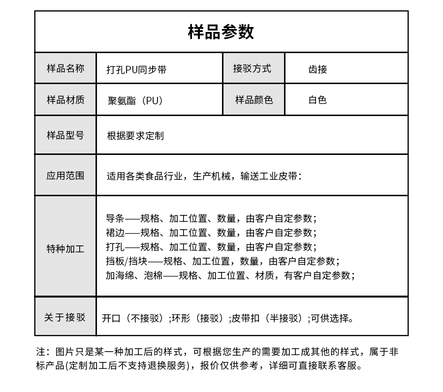 樣品名稱 | 打孔PU同步帶 | 接駁方式 | 齒接 |