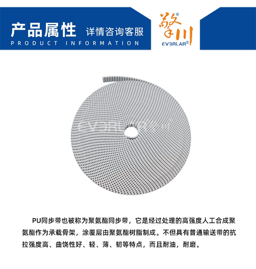 PU同步帶也被稱為聚氨酯同步帶,它是經過處理的高強度人工合成聚氨酯作為承載骨架,涂覆層由聚氨酯樹脂制成。不但具有普通輸送帶的抗拉強度高、曲饒性好、輕、薄、韌等特點,而且耐油,耐磨。