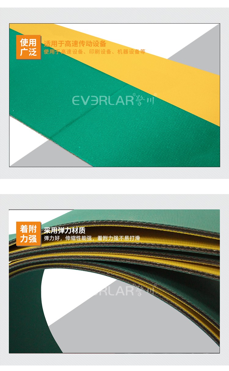 黃綠片基帶具有體質(zhì)量輕、強力高、使用伸長小、耐油耐磨性好、帶體柔軟、節(jié)能等特點:輕型輸送帶具有薄、軟、彈性好、伸長小、工作穩(wěn)定、使用壽命長等特點。