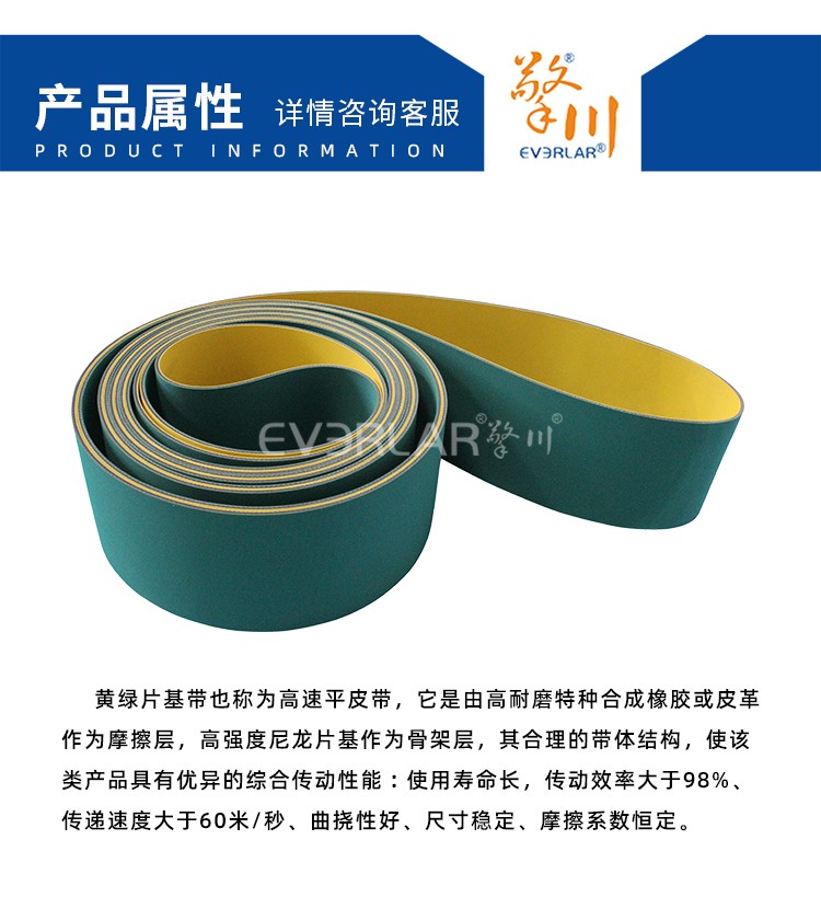 黃綠片基帶也叫高速環(huán)形橡膠平帶采用高強度、伸長率小、耐屈撓性能良好的骨架材料為強力層,傳動能力強,抗拉強度高,可采用較大的初張緊力;膠料采用高質(zhì)量的進口氯丁橡膠,耐熱、耐油、耐疲勞、耐磨性能良好,使用壽命長,是應(yīng)用zui多zui理想的一種高速傳動平帶。