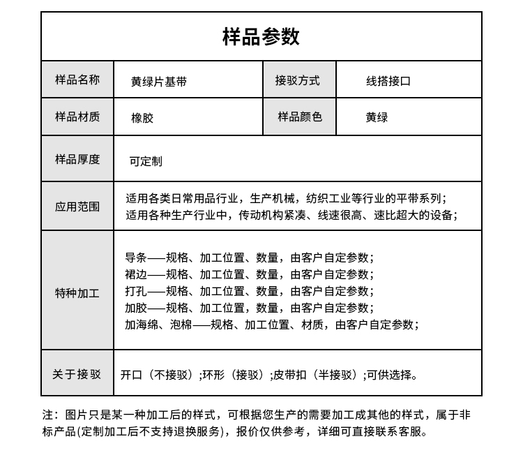 樣品名稱 | 黃綠片基帶 | 加工方式 | 線搭接口 |