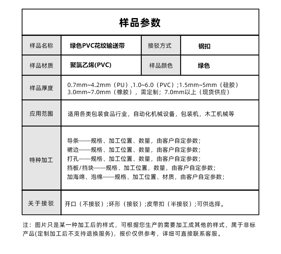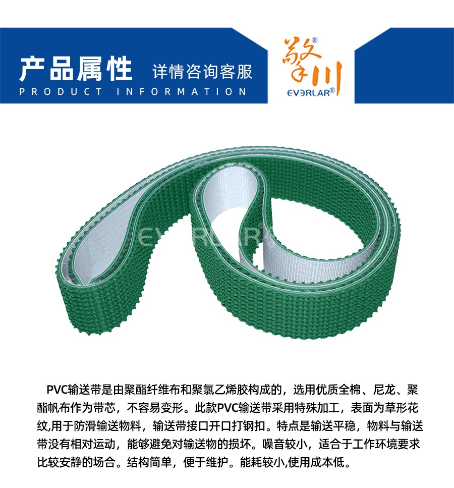 • 產品名稱:擎川everlar定制PVC輸送帶綠色花紋加鋼扣