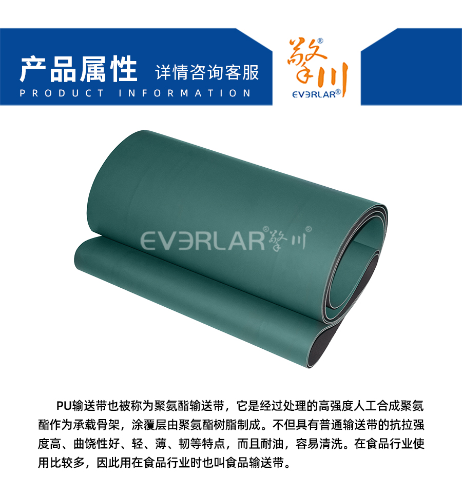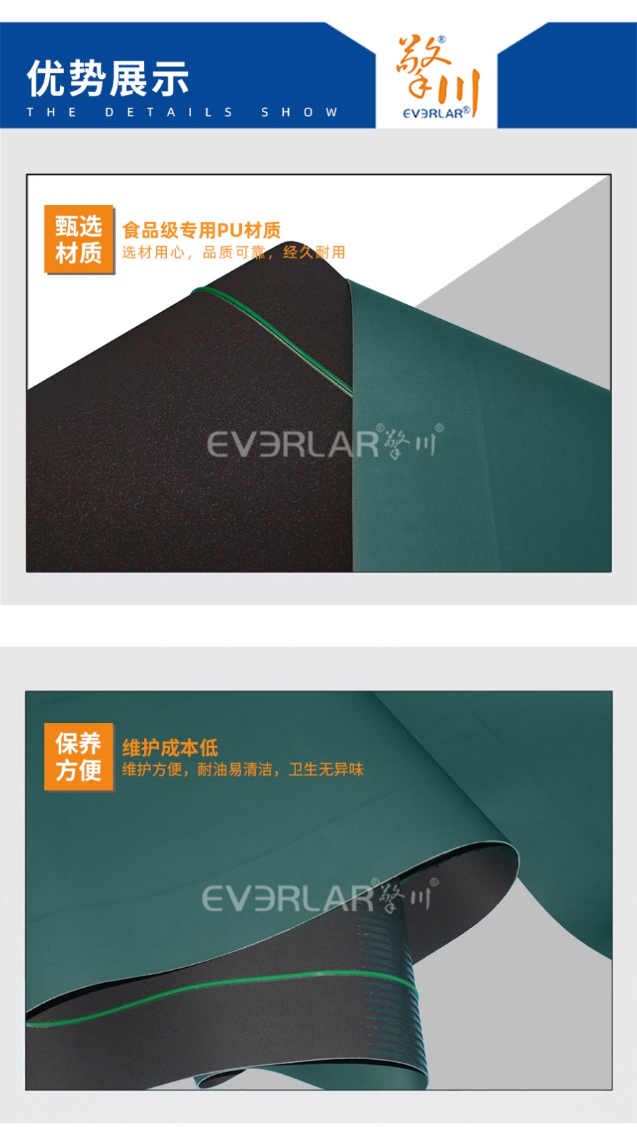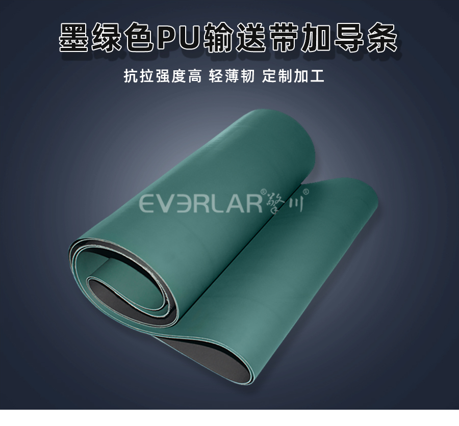 • 產(chǎn)品名稱:擎川everlar定制pu輸送帶墨綠色加雙導條食品輸送帶