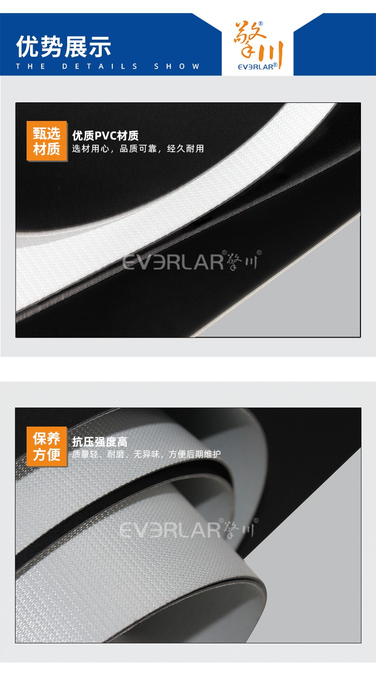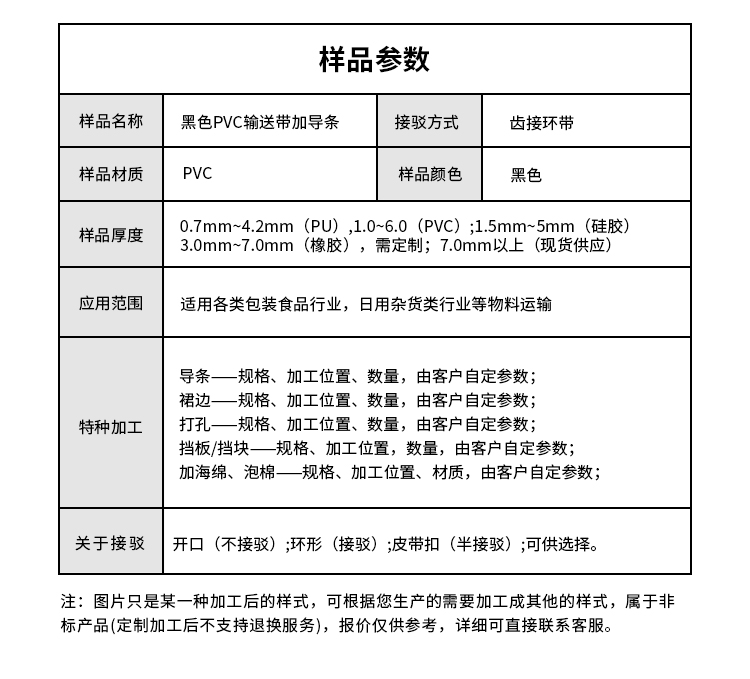• 產品名稱:擎川everlar定制黑色加導條PVC輸送帶食品包裝機械設備