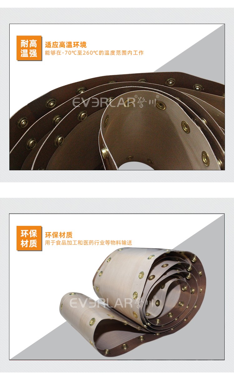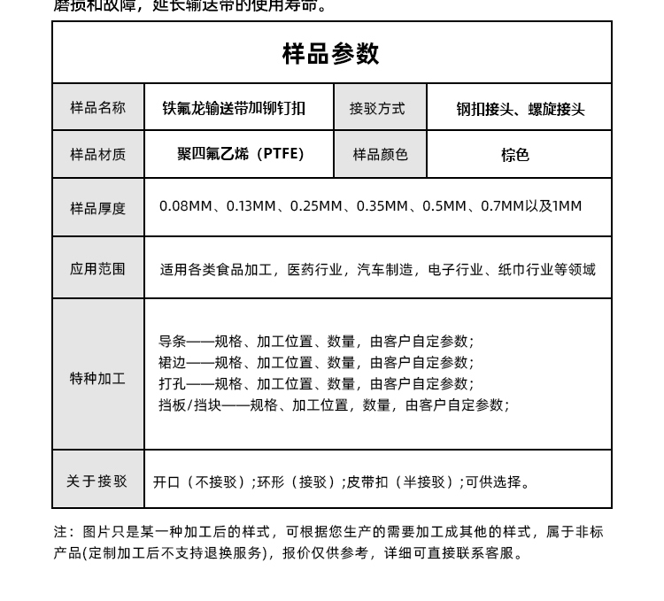 • 產品名稱:特氟龍輸送帶加鉚釘扣耐腐蝕耐高溫易清潔工業皮帶定制