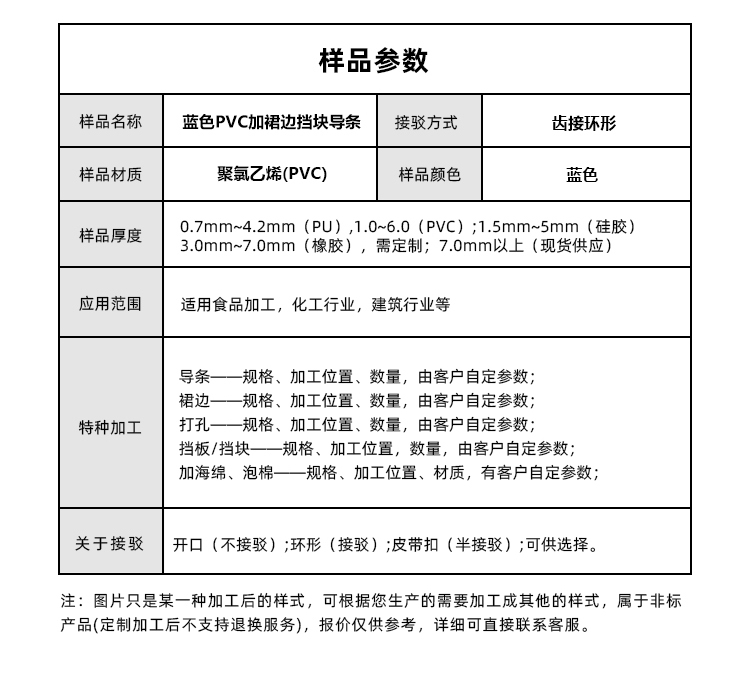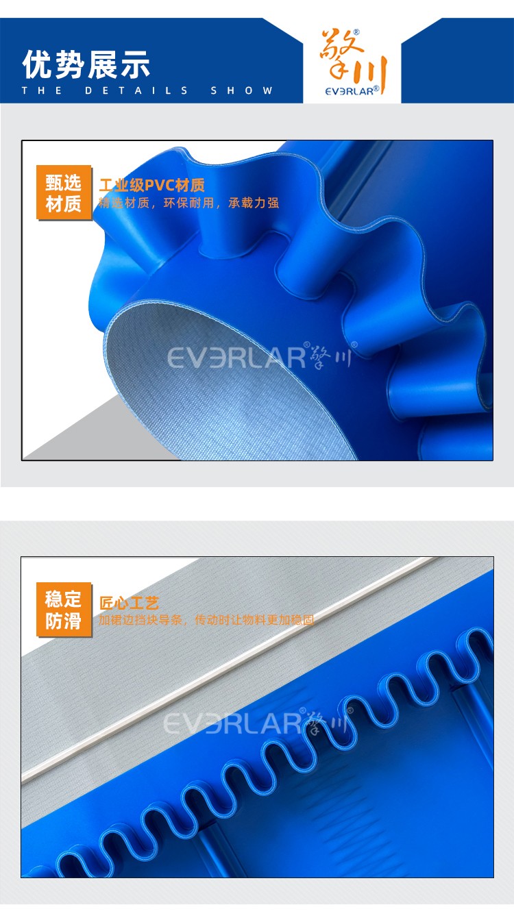產(chǎn)品名稱:藍(lán)色PVC輸送帶加裙邊擋板導(dǎo)條耐磨耐油耐腐蝕工業(yè)皮帶定制