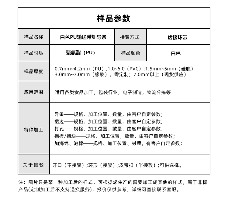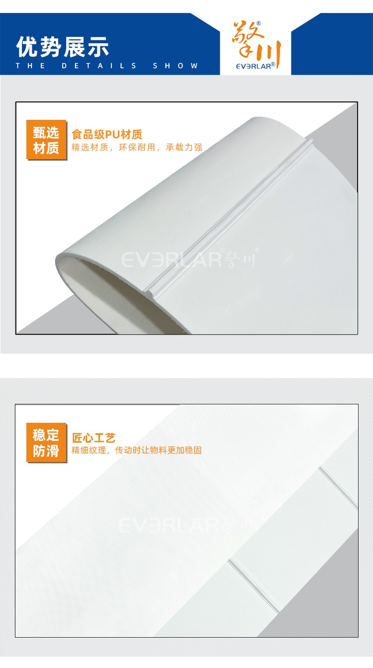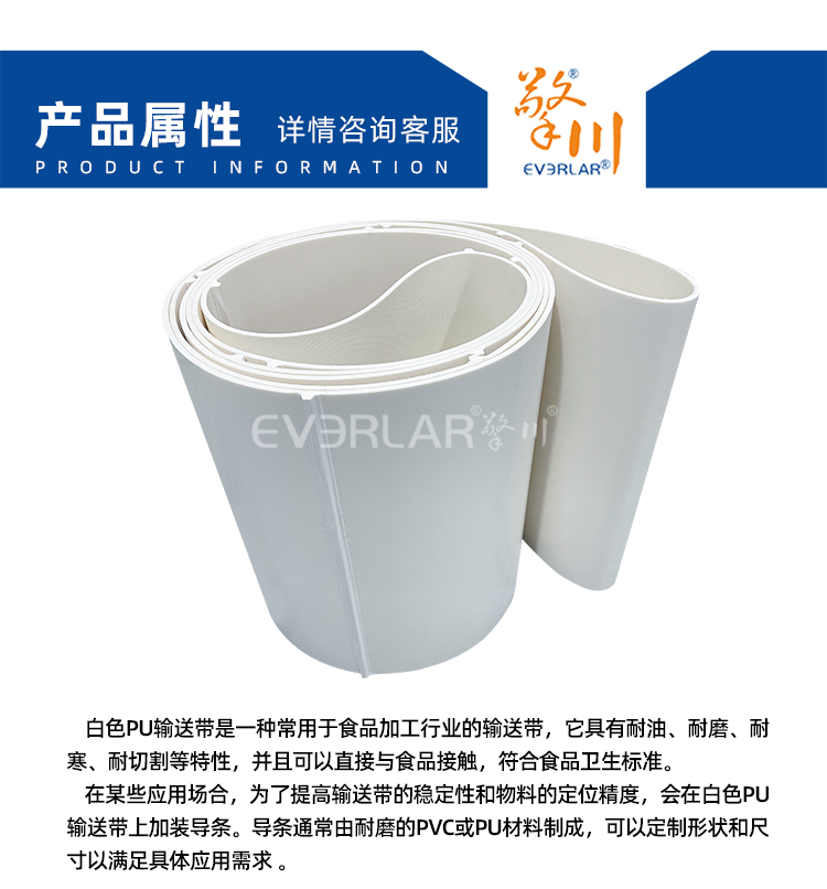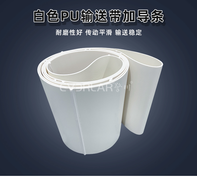 • 產(chǎn)品名稱:白色PU輸送帶加導條耐磨平穩(wěn)易清潔工業(yè)皮帶