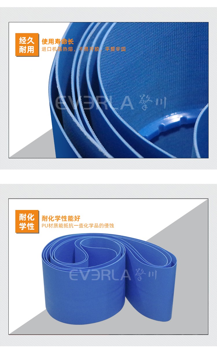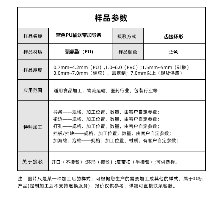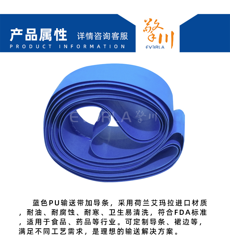 • 產品名稱:藍色PU輸送帶加導條耐磨耐油耐腐蝕工業皮帶定制