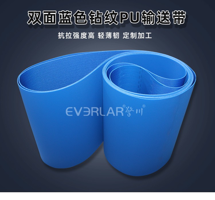 • 產品名稱:雙面藍色鉆紋PU輸送帶耐磨耐油食品級工業(yè)皮帶定制