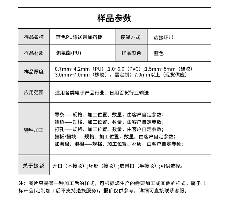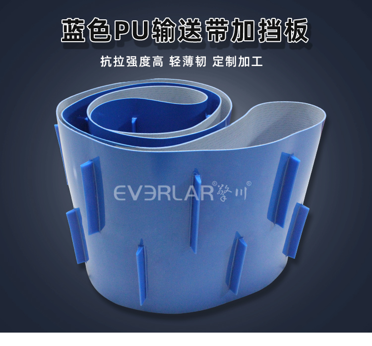 • 產品名稱:藍色PU輸送帶加擋塊耐磨耐油耐腐蝕工業皮帶