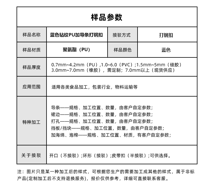 • 產品名稱:藍色鉆紋PU加導條打鋼扣耐磨耐油耐腐蝕工業皮帶