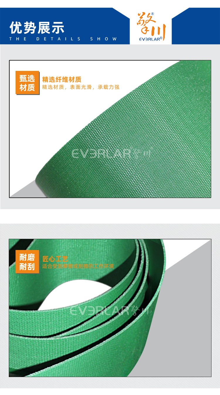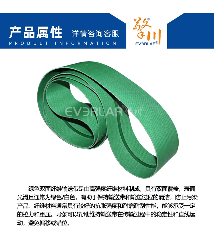 • 產品名稱:雙面纖維輸送帶綠色加導條防偏移包裝行業物料傳送皮帶定制