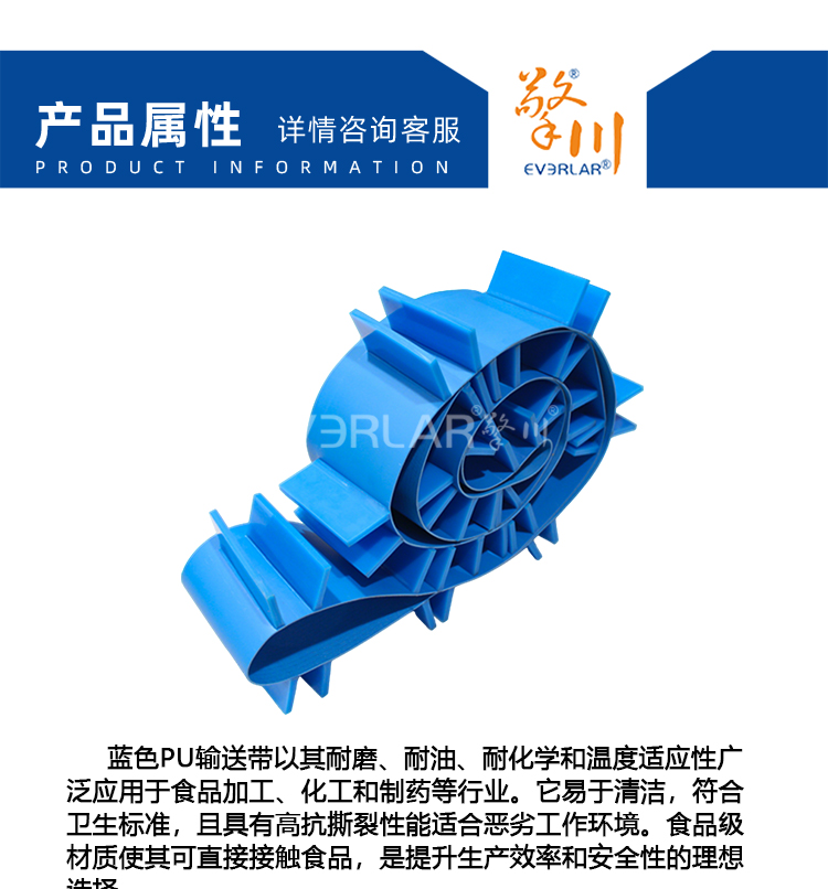 • 產品名稱:藍色PU輸送帶加擋板耐腐蝕食品級海鮮分揀機專配傳輸帶廠家定制