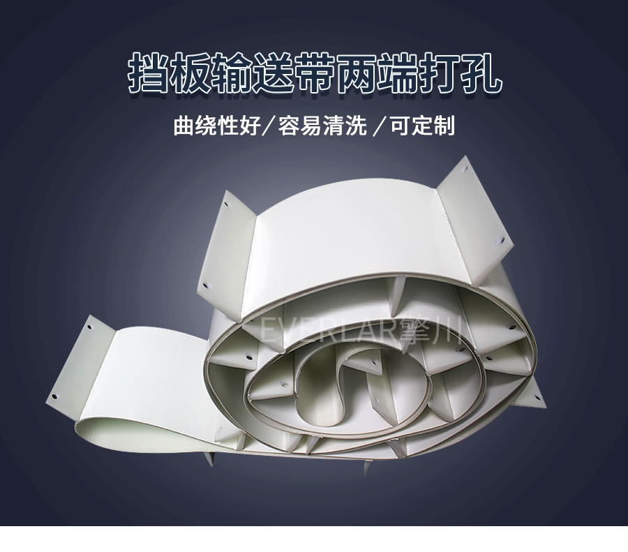 為食品、醫藥、包裝、日化提供一站式特殊定制從工廠到倉儲,PU輸送帶加擋板兩端打孔滿足多元輸送